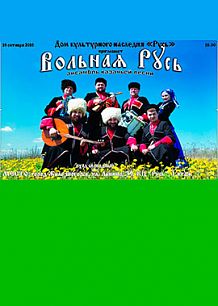 Концерт ансамбля казачьей песни «Вольная Русь» (г.Москва). Вас ждет атмосфера залихватского казачьего гулянья. Каждый присутствующий на концерте ощутит себя полноправным участником действа В репертуаре ансамбля: