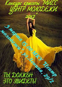 3 марта 15.00 в МКУ «Центр молодежи» (ул.Ленина 29/2) в преддверии 8 марта состоится конкурс красоты «Мисс Центр молодёжи-2017» среди представительниц волонтерского движения «Альтруист» Центра молодежи.