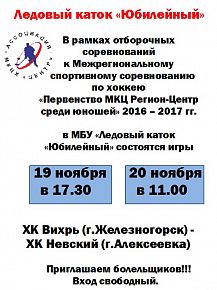 19 и 20 ноября в МБУ «Ледовый каток «Юбилейный» состоятся хоккейные игры в рамках отборочных соревнований к Межрегиональному спортивному соревнованию по хоккею «Первенство МКЦ Регион-Центр среди юношей» 2016 – 2017 гг. Встречаются команды "Вихрь" (г. Железногорск) и "Невский" (г. Алексеевка).