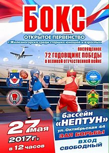 27 мая при поддержке Железногорской городской общественной организации ветеранов ВДВ и войск специального назначения «Крылатая гвардия» и Железногорского отделения Курской региональной общественной организации воинов-пограничников запаса «Зеленый легион» в зале борьбы бассейна «Нептун» состоится Открытое Первенство города по боксу среди старших юношей и взрослых, посвящённое 72-й годовщине Победы в Великой Отечественной войне.