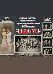 Образцовый дворец культуры Железногорска представляет: премьера спектакля ЭШЕЛОН, М.Рощин, - история великого противостояния. В спектакле заняты участники коллективов "Роза ветров", "ЮКМ", "Ноктюрн", "А-Микс" и артисты ДК.