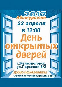 22 апреля в Железногорском политехническом колледже пройдёт День открытых дверей. Начало мероприятия в 12:00.