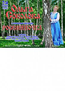Самая популярная железногорская певица Ольга Соколова представит зрителям свою новую концертную программу «Россияночка». Вас ждет теплое общение и песни для души, которые можно подпевать всем залом. В программе выступят ансамбли "Голоса России", "Радуйся", "Грация", "ЮКМ", "Лотос", "Соколочки", "Жемчужина КМА", а также Владимир Кудинов.