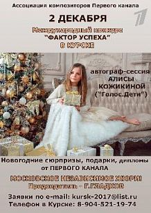 Ассоциация композиторов Первого канала 2 декабря проведет в Курске международный конкурс "Фактор успеха". Заявки принимаются по телефону 8-904-521-19-74 и электронному адресу kursk-2017@list.ru