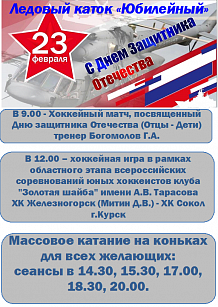 Ледовый каток "Юбилейный" 23 февраля приглашает железногорцев на хоккейный матч, посвященный Дню защитника Отечества, хоккейную игру в рамках областного этапа всероссийских соревнований юных хоккеистов клуба "Золотая шайба", между ХК "Железногорск" и ХК "Сокол", а также массовые катания на коньках.