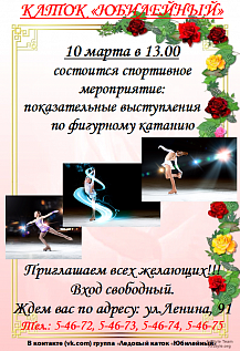 Ледовый каток "Юбилейный" приглашает железногорцев на показательные выступления по фигурному катанию. Вход свободный.