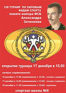 С 16 по 18 декабря в Железногорске пройдет традиционный Городской безэкипировочный турнир по пауэрлифтингу и жиму лежа среди юношей, девушек и мужчин, посвященный памяти сотрудника ФСБ майора А.Зачиняева, погибшего при исполнении обязанностей в Северо-Кавказском регионе. Главный судья соревнований – Крутобережский Владимир Максимович, 8-960-685-40-07. Начало соревнований: 16 декабря – 17:00 17 декабря – 14:00 18 декабря – 11:30 Торжественное открытие – 17 декабря в 15:00