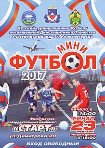 Железногорская городская общественная организация ветеранов ВДВ «Крылатая гвардия» совместно с региональной общественной организацией воинов-пограничников запаса «Зеленый легион» проводят турнир по мини-футболу среди команд 2007-2008 года рождения. 4 февраля: