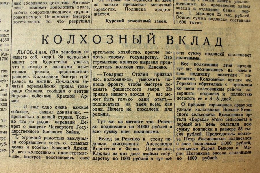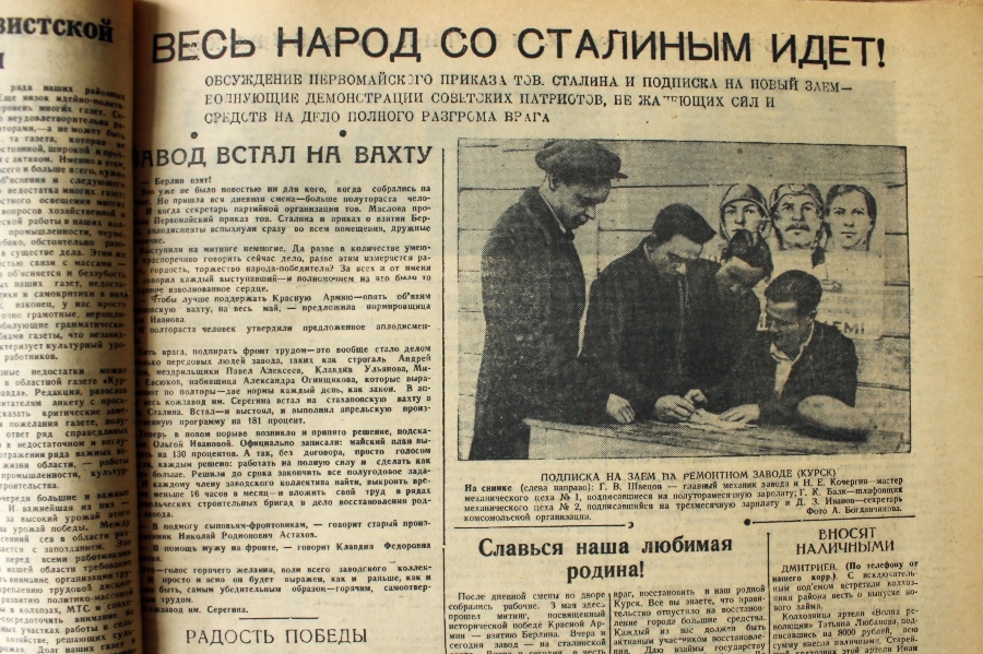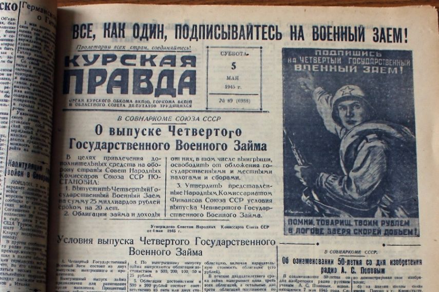 ЖелезногорскНовостиНовостиКак это было 80 лет назад: советские войска овладели Берлином, жители Курской области подписывались на военный займ Как это было 80 лет назад: советские войска овладели Берлином, жители Курской области подписывались на военный займ 02.05.2025 12:14 Дата 3907 Фото: Константин Строев Календарь Великой Победы по сообщениям «Совинформбюро» и страницам газеты «Курская правда». Фронт В первых числах мая 1945 года войска 1-го Белорусского и 1-го Украинского фронтов после упорных уличных боёв завершили разгром берлинской группы немецких войск и полностью овладели столицей Германии Берлином. Советские воины продолжали подавлять сопротивление последних небольших групп противника, пытавшихся прорваться из окрестностей города на запад. Были захвачены города Росток, Варнемюнде, Виттенберг, Бранденбург. Десятки тысяч немецких офицеров и солдат сдавались в плен. 2-й Украинский фронт освободил Словакию. Началась Пражская операция. 1 мая все газеты опубликовали приказ Верховного Главнокомандующего Сталина № 20, в котором, в частности, говорилось: «Воины Красной Армии и Военно-Морского Флота! Идет последний штурм гитлеровского логова. В завершающих боях покажите новые образцы воинского умения и отваги. Крепче бейте врага, преследуйте и окружайте немецких захватчиков, не давайте им передышки, пока они не прекратят сопротивления. Трудящиеся Советского Союза! Упорным и неутомимым трудом умножайте всестороннюю помощь фронту. Быстро залечивайте раны, нанесенные стране войной, поднимайте еще выше мощь нашего Советского государства!» В этом же приказе Ленинград, Одесса, Севастополь и Сталинград названы городами-героями. Фото: Константина Строева Тыл 5 мая 1945 года «Курская правда» публикует постановление Совнаркома СССР о 4-м государственном военном займе на сумму 25 мрд рублей сроком на 20 лет для привлечения дополнительных средств на оборону. Страна с величайшим подъёмом подписывается на него. На Курском ремонтном заводе главный механик Швецов и мастер механического цеха № 1 Кочергин подписались на полуторамесячную зарплату, шлифовщик Балк – на трёхмесячную. Колхозники артели «Борьба» Больше-Угонского сельсовета Льговского района в первый же день оплатили всю подписку государственного займа – 55 тысяч рублей. Председатель колхоза Пётр Масленников внес наличными 5 тысяч рублей, звеньевые Мария Быкова и Мария Цыганкова по тысяче. Фото: Константина Строева. В этом же номере фоторепортаж о визите в Курск председателя Британского Комитета «Фонда помощи России» госпожи Климентины Черчилль. После торжественной встречи на вокзале супруга премьер-министра Великобритании посетила детскую больницу, детсад № 23, где ребята поднесли ей полевые цветы, детский дом для сирот, чьи родители погибли. На площади Перекальского её тепло приветствовали студенты и преподаватели медицинского института. Поздравляя студентов с выбранной профессией, госпожа Черчилль отметила, что «медицина во все века служила народам, а теперь после этой ужасной войны необходима, как никогда.» О чём, не могла написать «Курская правда» в эти дни, так это о том, что 6 мая 1945 года православные христиане готовились отметить Светлое Воскресение Христово. 80 лет Победы календарь Победы Вернуться к списку новостей Предложить новость