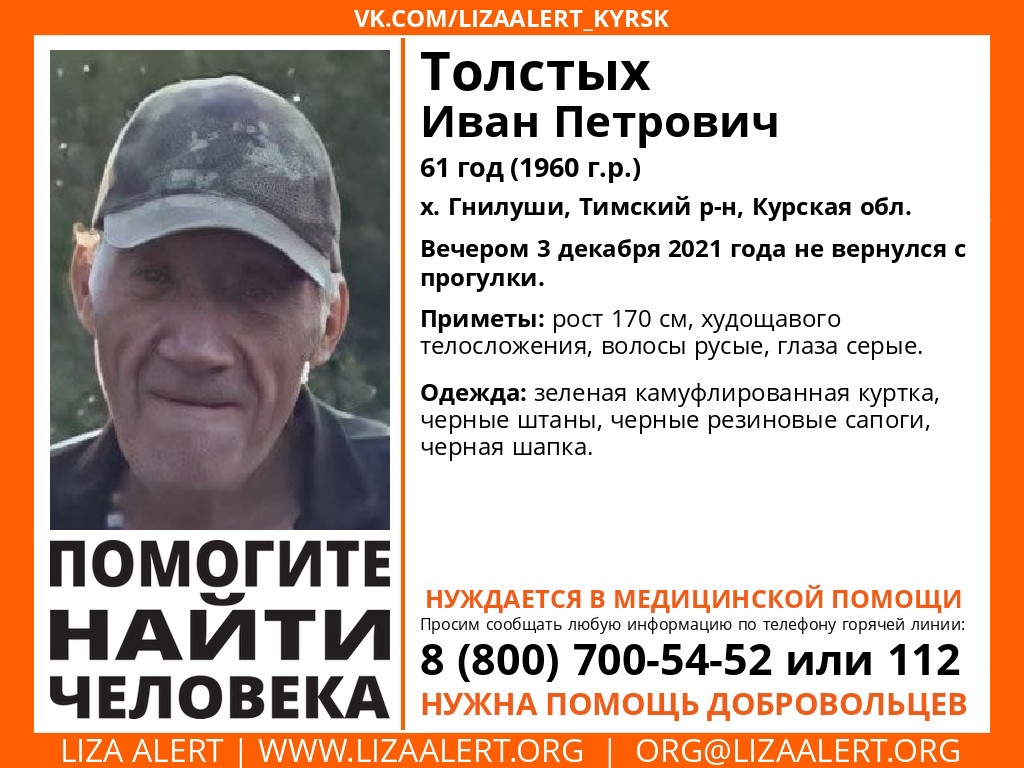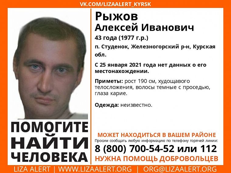 ЖелезногорскНовостиНовости в ЖелезногорскеПоиск не прекращается: курский отряд «Лиза Алерт» напоминает о ненайденных людях Поиск не прекращается: курский отряд «Лиза Алерт» напоминает о ненайденных людях 12.01.2022 15:34 В Железногорске и области 649 Фото: vk.com/lizaalert_kyrsk Волонтёрам нужна помощь! Поисковики опубликовали ориентировки на жителей региона, которые по-прежнему числятся в списках, пропавших без вести. «Мы просим помощи в распространении ориентировок! Этих людей очень ждут родные и близкие!», – отметили в отряде. При поисковых работах большую роль играет массовое оповещение о пропавшем человеке. Благодаря свидетельствам от неравнодушных граждан было найдено огромное количество людей! Важность репостов сложно оценить, иногда именно они возвращают человека домой. Посмотрите на эти фото внимательно. Возможно Вы кого-то узнаете. Фото: vk.com/lizaalert_kyrsk С поисковым отрядом «Лиза Алерт» можно связаться по телефону бесплатной горячей линии: 8-800-700-54-52. Курская область лиза алерт поиск Вернуться к списку новостей Предложить новость