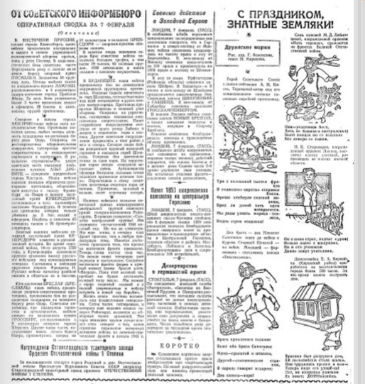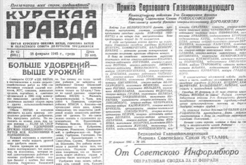 ЖелезногорскНовостиНовости обществаКак это было 80 лет назад: советские войска приближались к Берлину, в Курской области готовились к посевной Как это было 80 лет назад: советские войска приближались к Берлину, в Курской области готовились к посевной подготовил Константин Строев 08.02.2025 09:08 Общество 1075 Фото: газета "Курская правда", февраль 1945 год Календарь Великой Победы по сообщениям «Совинформбюро» и страницам газеты «Курская правда». На фронте В начале февраля 1945 года советские войска продолжали наступление на всех фронтах. Части 1-го Белорусского и 1-го Украинского фронтов форсировали Одер и захватывали плацдармы на правобережье. 3 февраля 1945 года завершилась Варшавско-Познанская операция, в результате которой были освобождены западная часть Польши и столица Варшава. Польская печать широко комментировала братский дар русского, украинского, белорусского и литовского народов – 60 тыс. тонн хлеба жителям героической Варшавы, «расценивая этот акт помощи польскому народу, как проявление глубочайшей дружбы польского и советского народов.» В районе Кёнигсберга наши войска вели бои по очищению от противника Земландского полуострова. В Будапеште продолжалось уничтожение окруженной группировки противника. 4 февраля в Ялте открылась Крымская конференция руководителей трёх великих держав антигитлеровской коалиции СССР, США и Великобритании. На ней решались фундаментальные вопросы послевоенного политического устройства мира, в том числе, раздел и ремилитаризация Германии. Фото: https://t.me/may_9_ru/419 В тылу В начале февраля «Курская правда» опубликовала обращение колхозников Глушковского района ко всем колхозникам, рабочим и служащим МТС и совхозов, ко всем работникам сельского хозяйства Курской области «Выходите на соревнование за урожай Победы». Один из пунктов взятых обязательств гласил: «До 15 марта вывезем на поля не меньше 32 тысяч тонн навоза, соберем 8 тысяч центнеров золы, 2,5 тысячи центнеров птичьего помета. Колхоз «Красный партизан» уже сделал двести ручных салазок. Сделаем салазки во всех колхозах, чтобы в вывозке удобрений приняли участие все колхозники от мала до велика». Из Шебекино по телефону в газету сообщали: «300 центнеров с гектара свёклы и 15 центнеров зерновых с гектара – урожай ефремовского звена М. Морозовой из колхоза «Правда», полученный в прошлом году. Звено обязалось в нынешнем году добиться ещё лучших результатов и уже давно готовится к севу». Отмечая 8 февраля вторую годовщину освобождения областного центра от фашистов, «Курская правда» опубликовала дружеские шаржи на знатных земляков. Один из них посвящался Герою Советского Союза капитану-лейтенанту Кисову: Три с половиной тысячи фрицев в подводное царство отправил Кисов. Фрицы хлебнули холодной водицы. Вряд ли домой хоть один возвратиться. Мы рады узнать моряка – земляка. Видно героя из далека». Фото: Константин Строев Братьям Сапоговым, один из которых воевал, а другой трудился на заводе «Текстильмаш» посвящались следующие строки: «Врага проклятого толково бьют оба брата Сапоговы. Один - гранатой и штыком. Другой – стахановским станком. В народе говорят не даром – два сапога пара». Семь сыновей матери-героини курянки Марии Дмитриевны Лобынцевой сражались на фронте: «Она – участница боёв. Хоть не бывала в наступлении. Бьют немцев по её веленью в