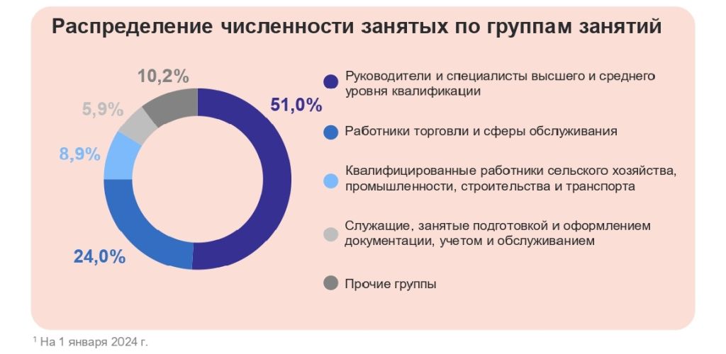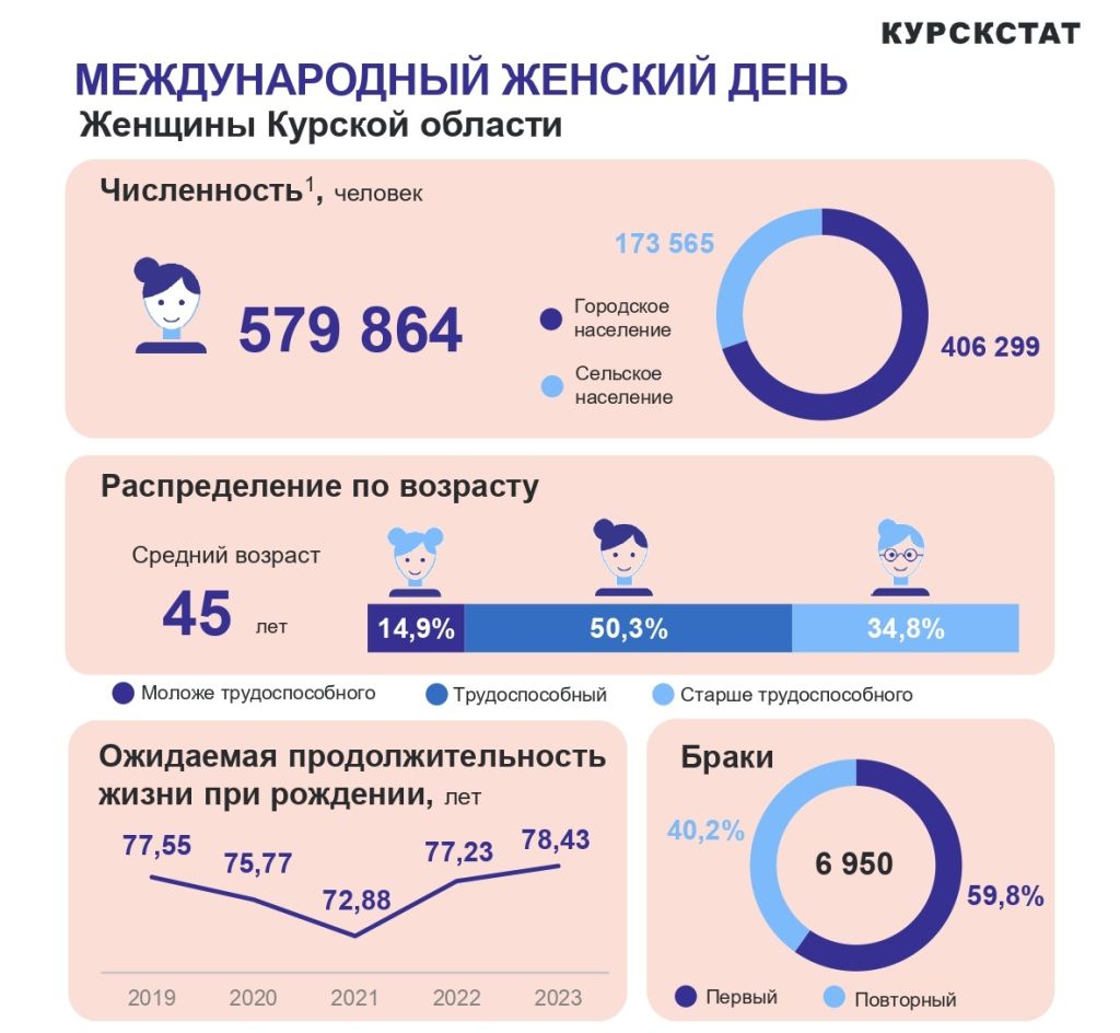 ЖелезногорскНовостиНовости общества70% курянок проживают в городах 70% курянок проживают в городах 08.03.2025 18:25 Общество 828 Фото: shedevrum.ai Курскстат подготовил к 8 Марта «женскую» статистику. На начало 2024 года численность представительниц прекрасного пола Курской области составила почти 580 тыс. человек, из которых более 70,1% – это городские жительницы. Средний возраст курянок – 45 лет. Чуть более половины (50,3%) – это женщины трудоспособного возраста, 34,8% – пенсионерки и 14,9% – девочки до 15 лет. Наиболее распространенный возраст у курянок для создания семьи – от 18 до 24 лет (34,8%). Ожидаемая продолжительность у женщин составляет 78 лет. 51% женщин, проживающих в Курской области, являются руководителями и специалистами высшего и среднего уровня квалификации, 24% работают в торговле и сфере обслуживания, 8,9% – квалифицированные работники сельского хозяйства, промышленности, строительства и транспорта, 5,9% – служащие, занятые подготовкой документации и учётом, 10,2% – прочие группы. Курскстат Вернуться к списку новостей Предложить новость