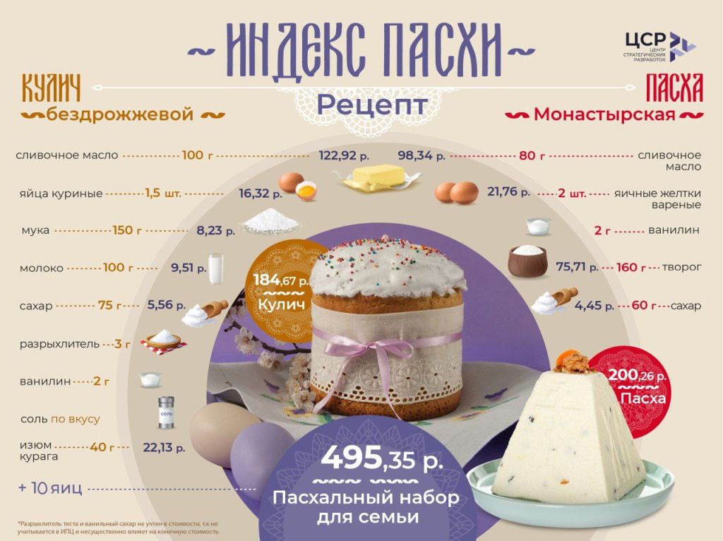 ЖелезногорскНовостиНовости обществаИндекс Пасхи: стоимость пасхального набора в Курской области повысилась за год на 5,2% Индекс Пасхи: стоимость пасхального набора в Курской области повысилась за год на 5,2% 18.04.2025 12:28 Общество 326 Фото: shedevrum.ai Центр стратегических разработок сравнил стоимость ингредиентов по регионам России для приготовления обязательных блюд пасхального стола. «Индекс Пасхи» сделан из расчёта на среднестатистическую семью из 4 человек. Аналитики подсчитали, что средняя цена продуктов для приготовления одного кулича, творожной пасхи и десятка яиц в 2025 году в России составила 495,35 рубля. По сравнению с прошлым годом стоимость этого набора в целом по стране выросла на 11,7%. Жителям Курской области пасхальный набор обойдётся в 445 рублей 17 копеек. Стоимость за год выросла на 5,2 %. Фото://t.me/moscowcsr/3512 В топ российских регионов по самой минимальной стоимости вошли Мордовия (397,28), Пензенская область (402,43), Чувашия (409,29), Кировская область (412,35), Нижегородская область (414,57 рубля). Топ-5 регионов по наименьшему росту цены Адыгея и Орловская область (+1,1%) Смоленская область (+3,1%) Псковская область (+3,9%) Курская область (+5,2%) Белгородская (+5,5%). Индекс Пасхи не является идеальным показателем паритета покупательной способности, поскольку он учитывает только расходы на продукты и не учитывает многие другие категории товаров и услуг. В частности, в стоимости не учтены затраты электроэнергии или газ для приготовления. Тем не менее, он наглядно показывает, как относительная доступность продуктов в разных регионах страны, отмечают аналитики. Набор продуктов для приготовления «пасхального набора» на праздничный стол: Кулич (бездрожжевой): мука пшеничная 150 г, сливочное масло 100 г, сахар 75 г, яйцо 1,5 шт., изюм, курага 40 г, молоко 100 мл, ванилин 2 гр., разрыхлитель 3 г, соль (по вкусу). пасха «Монастырская»: сливочное масло 80 г, сахар-песок 60 г, яичные желтки варёные 2 шт., творог 160 г, ванилин 2 г. Крашеные яйца 10 шт. Пасха Индекс кулича Вернуться к списку новостей Предложить новость