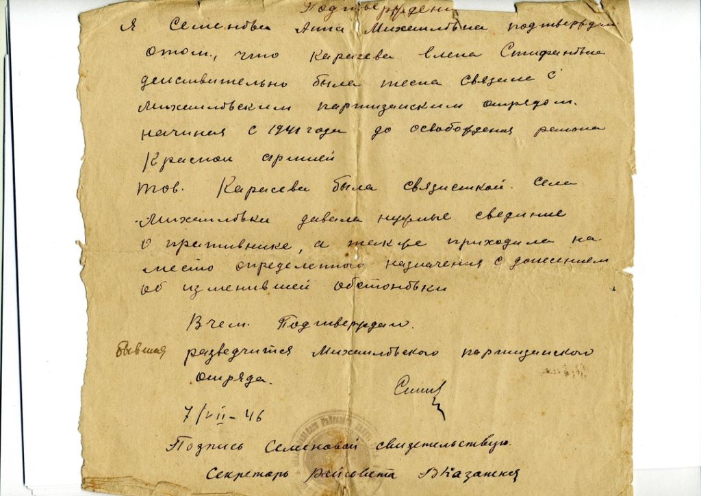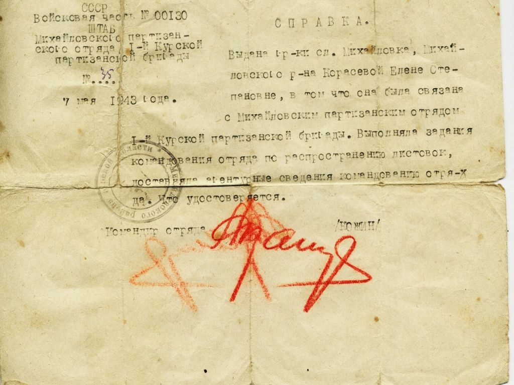 ЖелезногорскНовостиНовости обществаАртефакты войны из старого шкафа достали железногорцы Шумлянцевы Артефакты войны из старого шкафа достали железногорцы Шумлянцевы Алёна Мяснянкина 13.05.2025 18:23 Общество 1330 Фото: Алёны Мяснянкиной / Николай и Наталья Шумлянцевы Разбирая архивы в старинном семейном доме, супруги Николай и Наталья Шумлянцевы обнаружили фотографии и документы военных лет. Они отдали их в краеведческий музей и поделились с Zhel.city рассказом о родственниках – связной партизанского отряда Елене Карасевой и других членах семьи в годы Великой Отечественной войны. Родовое гнездо «У моего дедушки Карасева Стефана Яковлевича и бабушки Акулины Макарьевны было 18 детей, но к началу войны осталось пятеро, остальные умерли от тифа. Михайловская помещица Степанова, крёстная мать детей Карасевых, в 1917 году, поняв, что будет раскулачена, написала дарственную. И отдала деду торговую лавку в Михайловке. Стефан Яковлевич снёс это сооружение и возвёл из него дом», – начал рассказ Николай Шумлянцев. По словам железногорца и сейчас, спустя больше ста лет, это их родовое гнездо выглядит очень красиво: с резными наличниками и металлической крышей. Фото: Дома в Михайловке военного периода / Из найденного семейного архива Карасевых-Шумлянцевых «Залазишь на чердак, швы сгнили, а металлопрокат целый. Вот какое было качество. И я, и уже мои дети – все выросли в этом доме», – говорит Николай. Но время идёт, и Шумлянцевы построили рядом новое жильё, а в старом принялись разбирать архивы. Попались старинные монеты, вырванная страница из церковной книги о рождении в 1897 году Стефана Карасева. Оказались тут и уже истлевшие от времени справки, выданные Елене Карасевой, дочке Стефана Яковлевича, тёте Николая Шумлянцева. В этих бумагах разные люди подтверждали, что была она связной партизанского отряда. Фото: Справки, выданные Елене Карасевой / Из найденного семейного архива Карасевых-Шумлянцевых По информации Железногорского краеведческого музея В годы Великой Отечественной войны связные были важным звеном партизанских формирований. К концу 1941 года в Курской области был создан специальный институт связных в количестве 175 человек, которые обеспечивали регулярную связь с партизанскими отрядами и доведение приказов 4-го отдела УНКВД. В их задачи входила передача командованию полученных сведений о противнике в оккупированных населенных пунктах, доставка оружия и взрывчатки для проведения боевых операций и диверсий, распространение среди партизан и населения агитационных листовок и газет, обеспечение партизан продуктами, одеждой, обувью, помощь в бытовых делах, стирке и шитье, при необходимости – укрытие и спасение партизан. Если связные не могли в силу обстоятельств получить информацию от агентов на встречах, то осуществлялась безличная связь, при помощи «почтовых ящиков»: в дупле дерева, куче хвороста, под камнем. Михайловский партизанский отряд был образован 3 октября 1941 года. Связная Карасева Елена Степановна (Стефановна) с первых дней оккупации и до его освобождения в 1943 году, держала тесную связь с отрядом, собирала и передавала сведения о численности фашистов, о вооружении врага. Квартира Карасевой служила явкой партизан и связистов. Сохранился документ военного времени: справка от 7 мая 1943 года, подписанная командиром Михайловског
