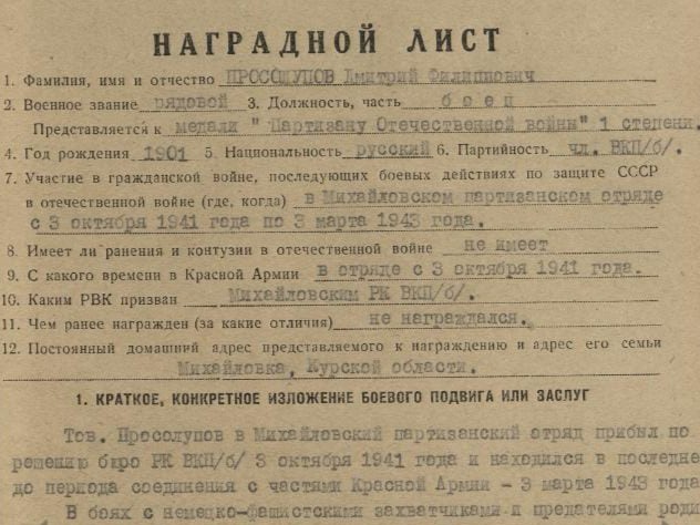 ЖелезногорскНовостиНовости обществаКак бабушка корову у немцев отнимала и другие истории из жизни партизанской семьи Как бабушка корову у немцев отнимала и другие истории из жизни партизанской семьи Алёна Мяснянкина 11.05.2025 15:09 Общество 1835 Железногорка Елена Максимова – продолжатель рода и профессии своего дедушки Дмитрия Просолупова. Как и он, женщина стала учителем, только педагогом начальных классов, а не историком. Но историю своей семьи знает хорошо и поделилась с Zhel.city несколькими сильными эпизодами. Не в кителе подвиг «До 9 класса я училась в селе Злобино. В праздничные майские дни мои одноклассники приносили фотографии дедушек в военной форме, с медалями, а у нас таких не было. И я по наивности как-то обратилась к маме: «Почему? Что это за ветеран такой, у которого нет медалей и кителей?» Мама объяснила, что дедушкина форма – фуфайка, ведь был он партизаном», – начинает рассказ Елена Александровна. Когда заканчивать десятилетку девочка перешла в Рышково, где жили её предки, тогда поняла, насколько велико было уважение односельчан к её деду: «Знаете, как в деревне обычно идёшь, а соседи спрашивают друг у друга, чья это внучка или внук. И называют по подворьям: Ивановы, Петровы. А про меня говорили: «Это Дмитрия Филипповича внучка». По отчеству!» Партизан Дмитрий Просолупова Фото: предоставлено Еленой Максимовой Оказалось, что и до войны, и после он был учителем рышковской школы. В музее «Большой Дуб» записано, что «трудный боевой путь с Михайловским партизанским отрядом прошли учителя-партизаны Богачев Аркадий Егорович, Просолупов Дмитрий Филиппович, Беседин Прохор Павлович». В воспоминаниях последнего написано: «15 июня 1942 года командование дало приказ осмотреть и подготовить оружие. Нашей 2-й роте было приказано занять комендатуру. Полезли через плетневую изгородь и пошли развернутым строем к зданию райкома, где она разместилась. Вдруг оттуда раздались выстрелы. Над зданием комендатуры взвились ракеты. Из окон немцы открыли пулемётную стрельбу. Партизаны залегли. Послали группу бойцов в обход, чтобы незаметно подползти и бросить в окна гранаты. Другие стреляли по окнам, отвлекая огонь. В окна комендатуры летят гранаты. По команде «Вперед!» бежим к зданию. Из окон валит дым. Мы занимаем здание рядом. Во дворе горит сарай, где у немцев хранится горючее. Раздаются взрывы – рвутся бочки. Наступает рассвет. В Михайловке стало тихо. Слышны выстрелы на мосту и на мельнице. Это партизаны уничтожают разбегающихся предателей Родины. В ту ночь было уничтожено до 100 гитлеровцев и полицейских, захвачено 48 винтовок, ручной пулемёт и много продовольствия. Партизаны потеряли 5 бойцов». Скрин наградного листа Фото: Предоставлено Еленой Максимовой «Шнелле-шнелле, вон отсюда» Дедушка Дмитрий умер до рождения Елены, а бабушка Катя поначалу на все расспросы только плакала, и её старались не беспокоить. Но со временем боль, видимо, поутихла, и некоторые эпизоды страшной жизни в оккупации дошли до родных. «У бабушки было четверо детей. Старшую пятнадцатилетнюю Марию прятали, отправляли к другой родне, чтоб немцы её не угнали. А трое мал мала жили в это страшное время вместе с ней в Рышково: мама моя, самая младшая 1937 года рождения, и её сестра и брат – 5 и 7 лет. Чем их кормить? Выручала корова. В деревне это настоящая кормилица: и молоко с ней есть, 